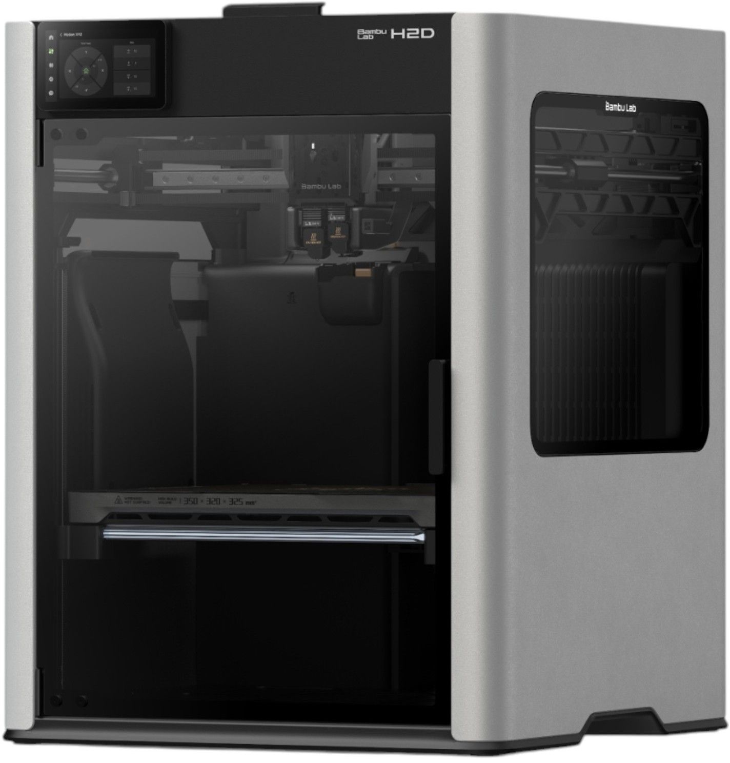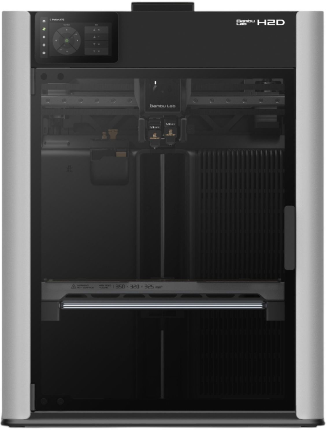 Bambu Lab H2D (PF003-D) - персональний виробничий пристрій, що об'єднує 3D-принтер, лазерний модуль і цифровий різьбяр в єдиному корпусі. Заснований на DUAL-X системі з двома незалежними екструдерами, що забезпечують друк в об'ємі до 350×320×325 мм (з двома головками) і до 325×320×325 мм (з однією). Працює з філаментом діаметром 1,75 мм і підтримує насадки діаметром 0,2/0,4/0,6/0,8 мм. Максимальна температура нагрівача - 350 °C, температура столу - 120 °C, камера підігрівається до 65 °C. Проекційне співвідношення 1,2:1, точність позиціонування - до 50 мікрон, швидкість переміщення - до 1000 мм/с, прискорення - до 20 000 мм/с². Bambu Lab H2D (PF003-D) сумісний із широким набором матеріалів, включно з PLA, PETG, TPU, PVA, BVOH, ABS, ASA, PA, PC, PET, а також наповнені волокном філаменти. H2D також може бути обладнаний лазером на 455 нм потужністю 10 або 40 Вт для гравіювання та різання. Також підтримується цифрове різання й автоматичне перемикання між режимами. Управління здійснюється через сенсорний дисплей і програмне забезпечення Bambu Studio. Присутні модулі Wi-Fi і камери для віддаленого спостереження і запису процесу. Корпус пристрою виконаний з алюмінієвого сплаву. Габарити - 492×514×626 мм, вага - 31 кг. Підключення до ПК здійснюється по Wi-Fi або через SD-карту. Bambu Lab H2D розрахований на користувачів, яким потрібне точне і гнучке обладнання для прототипування, малосерійного виробництва і роботи з різними типами матеріалів без необхідності в окремих пристроях.