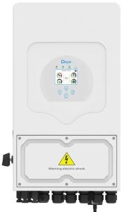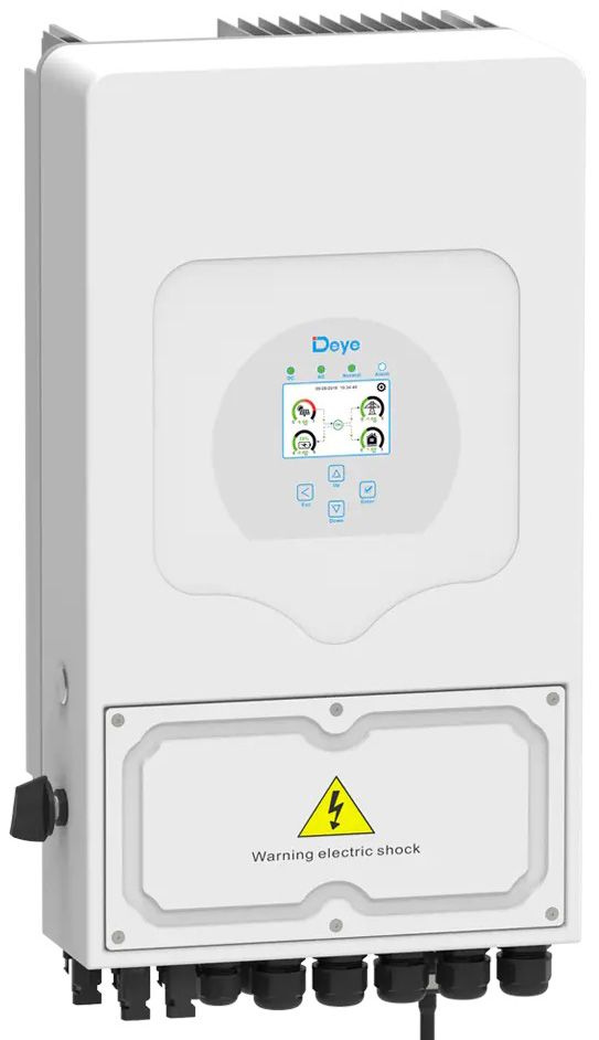 Deye SUN-5K-SG05LP1-EU - однофазний гібридний інвертор 230 В для систем з акумулятором 48 В класу, що поєднує інвертор з чистою синусоїдою, мережеву роботу і заряд від сонячних панелей через MPPT. Номінальна активна потужність Deye SUN-5K-SG05LP1-EU становить 5000 Вт, максимальна уявна - 5500 ВА, а пікова потужність в автономному (off-grid) режимі заявлена як 2× від номіналу протягом до 10 секунд, що допомагає витримувати короткочасні пускові струми. Акумуляторний вхід розрахований на свинцево-кислотні або літієві батареї з діапазоном напруги 40-60 В, один батарейний вхід, максимальний струм заряду і розряду - до 120 А, підтримується самоадаптація до BMS. Сонячна частина розрахована на максимальну "доступну" PV-потужність до 10000 Вт, максимальна вхідна DC-потужність до 8000 Вт, стартову напругу 125 В, діапазон MPPT 150-425 В, номінальну PV-напругу 370 В, максимальну PV-напругу 500 В; щодо струмів зазначено до 17 А на кожен MPPT і до 26 А струму короткого замикання на канал, що важливо при підборі сучасних панелей з високими струмами. Deye SUN-5K-SG05LP1-EU підтримує AC-coupling для модернізації наявної мережевої СЕС, роботу за розкладами (до 6 часових періодів заряду/розряду), паралельну роботу до 16 пристроїв для on-grid і off-grid сценаріїв, а також заряд/накопичення енергії від дизель-генератора. Ефективність: максимальна до 97,6%, Euro до 96,5%, MPPT >99%; THDi <3%, DC-інжекція <0,5% In. Виконання IP65, нерозв'язна топологія, "інтелектуальне" повітряне охолодження, шум <30 дБ, робочий діапазон -40...+60 °C, габарити 330×580×232 мм, маса близько 24,9 кг.